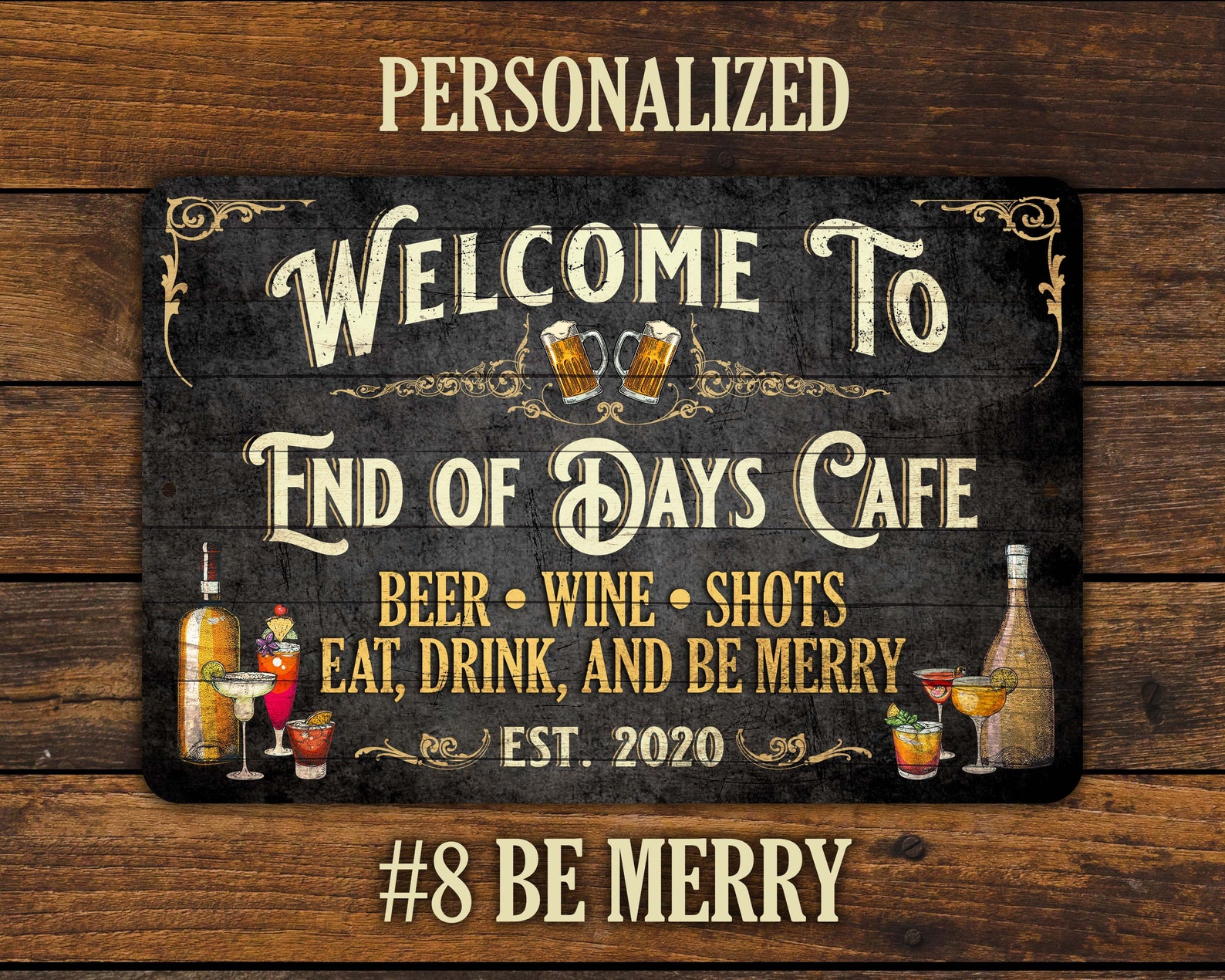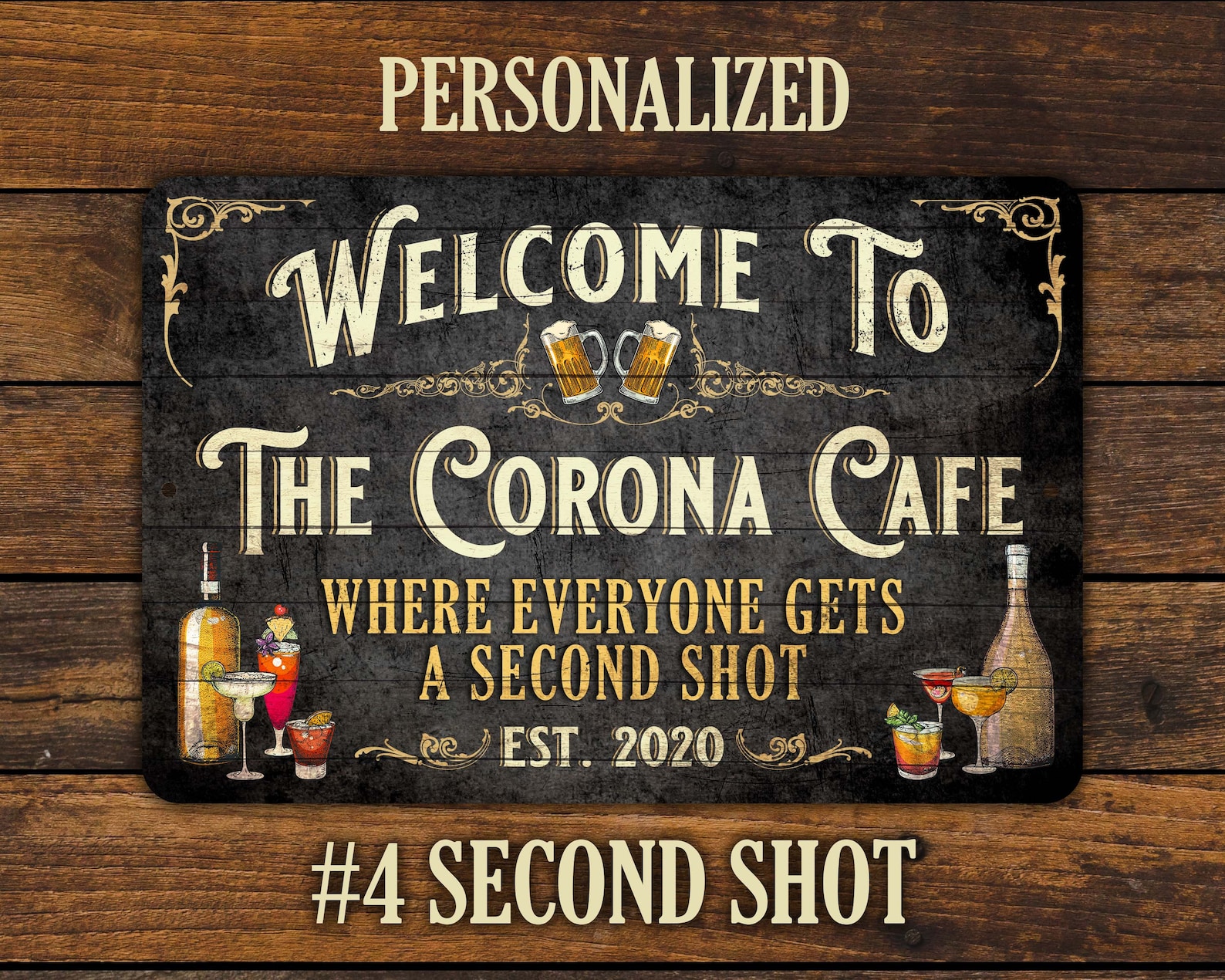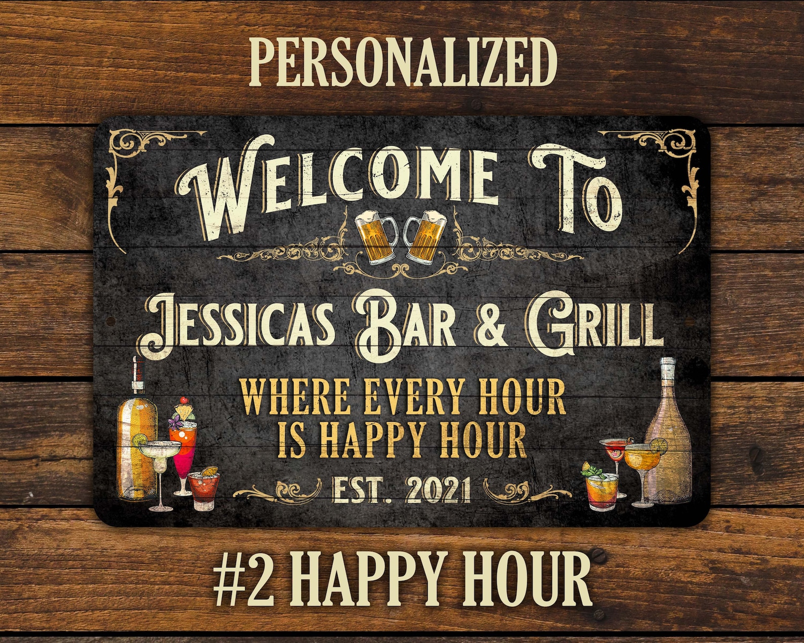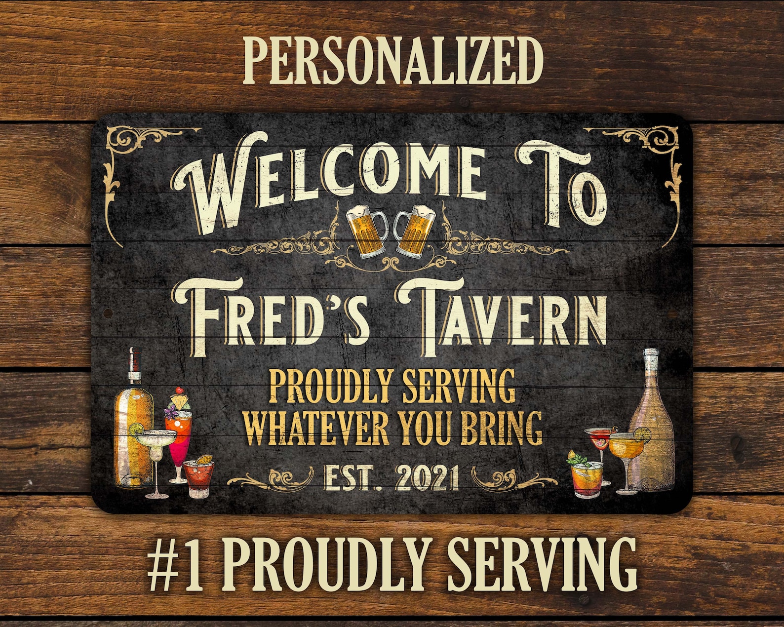 Elevate your home bar or party place with our personalized vintage sign. Crafted with care, this sign is made of aluminum and printed using dye sublimation, resulting in vibrant colors that last. The sign also features a glossy finish, which adds a touch of elegance to the rustic design.