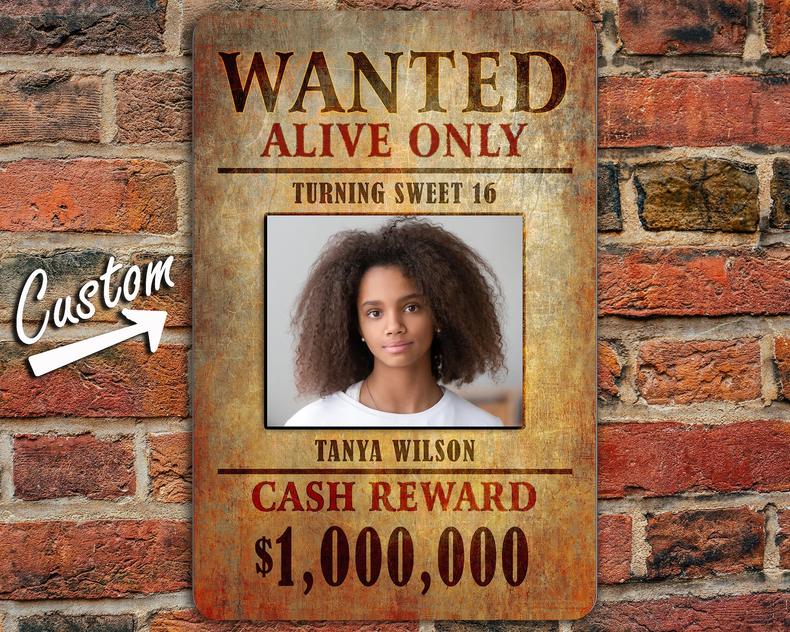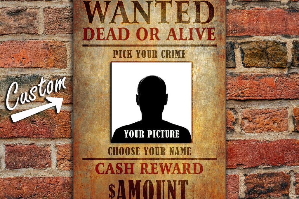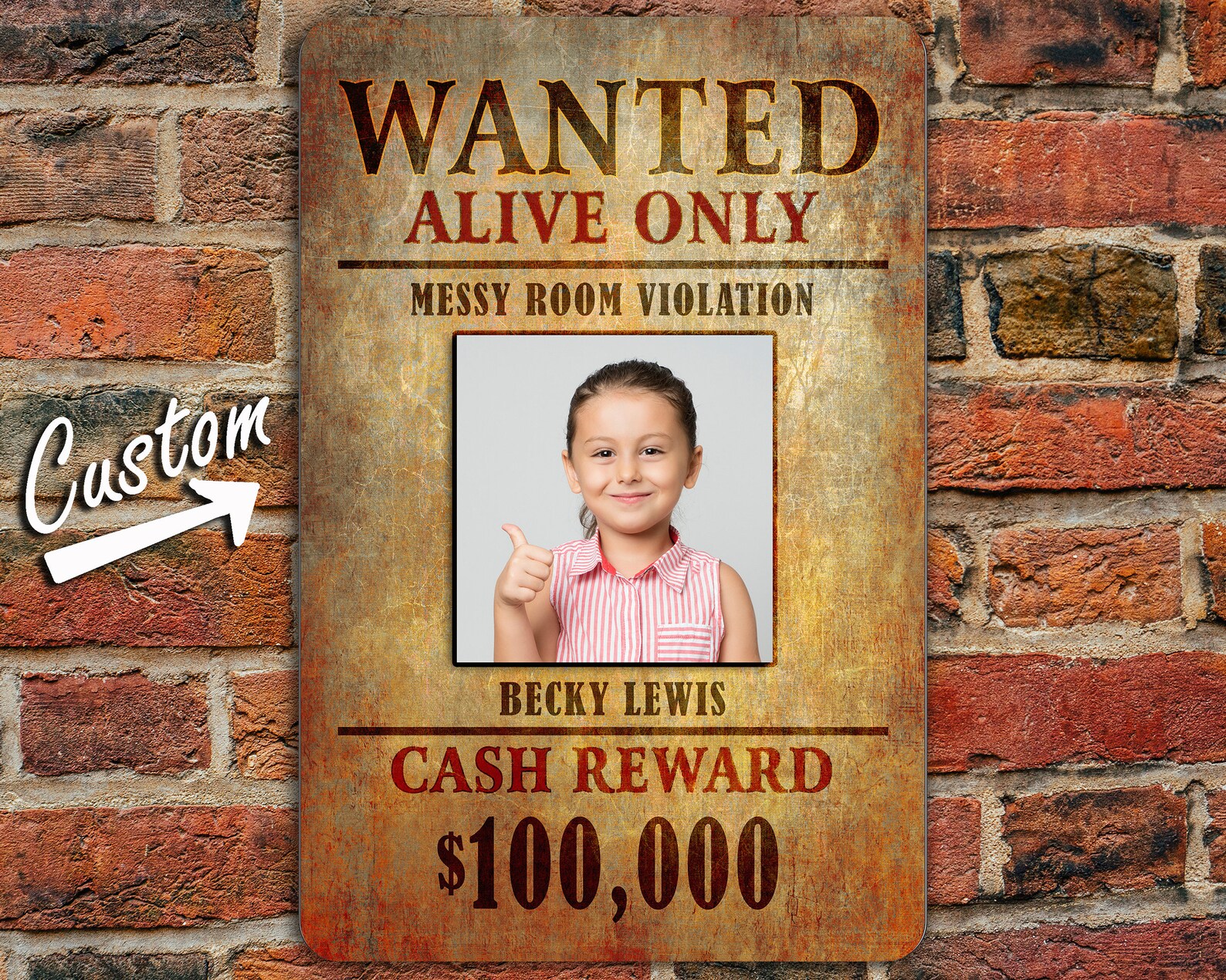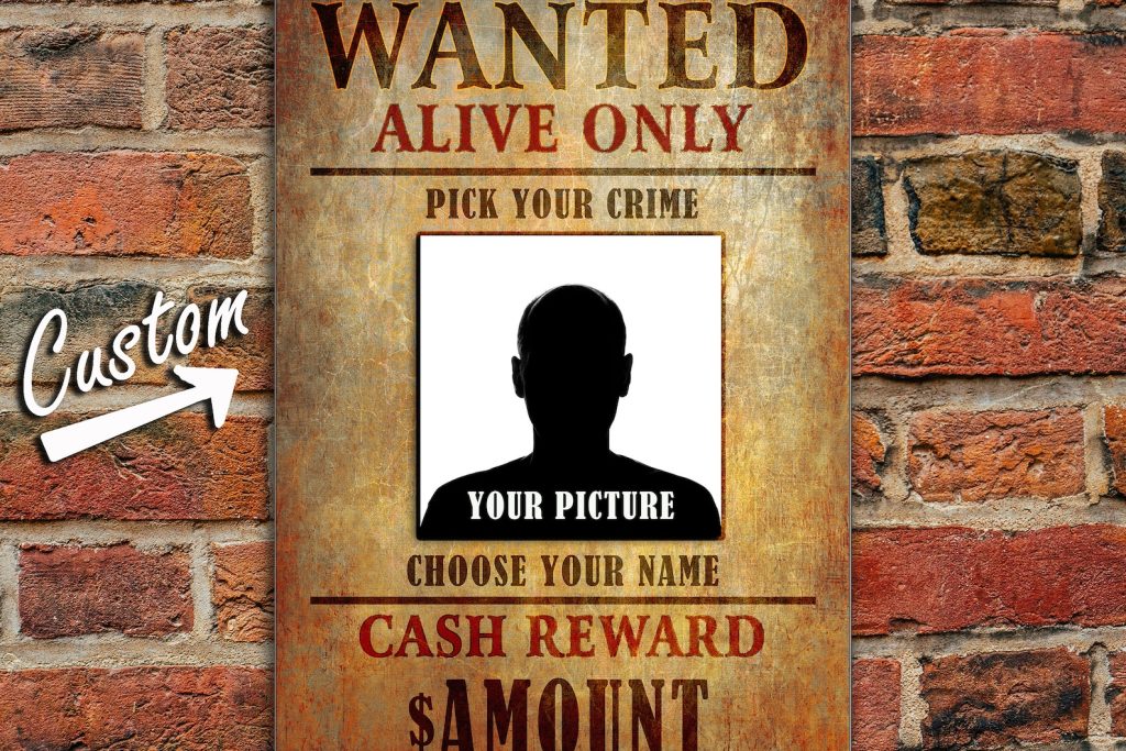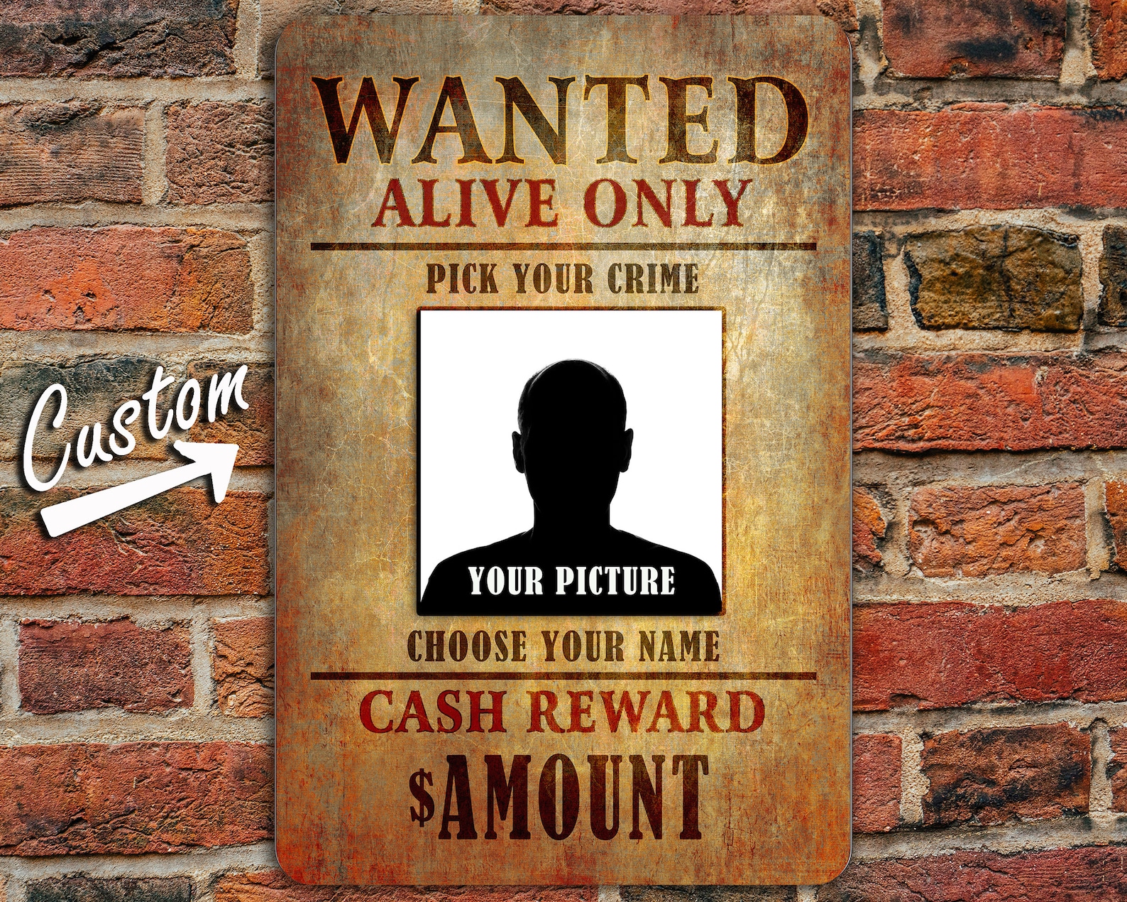 Personalized Wanted Sign. Customize this sign with a photo, choose a crime, add a name, and pick a reward amount! This sign can be given to almost anybody, from kids to pets! Use your imagination and make someone9;s day with this unique one-of-a-kind gift! The antique design will look great anywhere you choose to hang it!