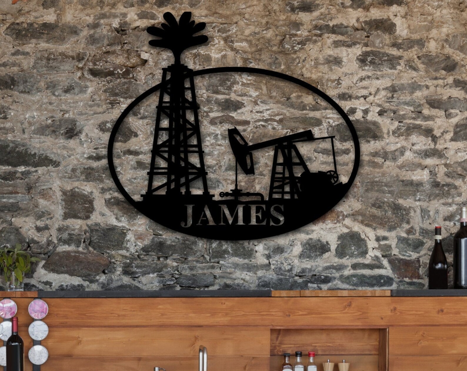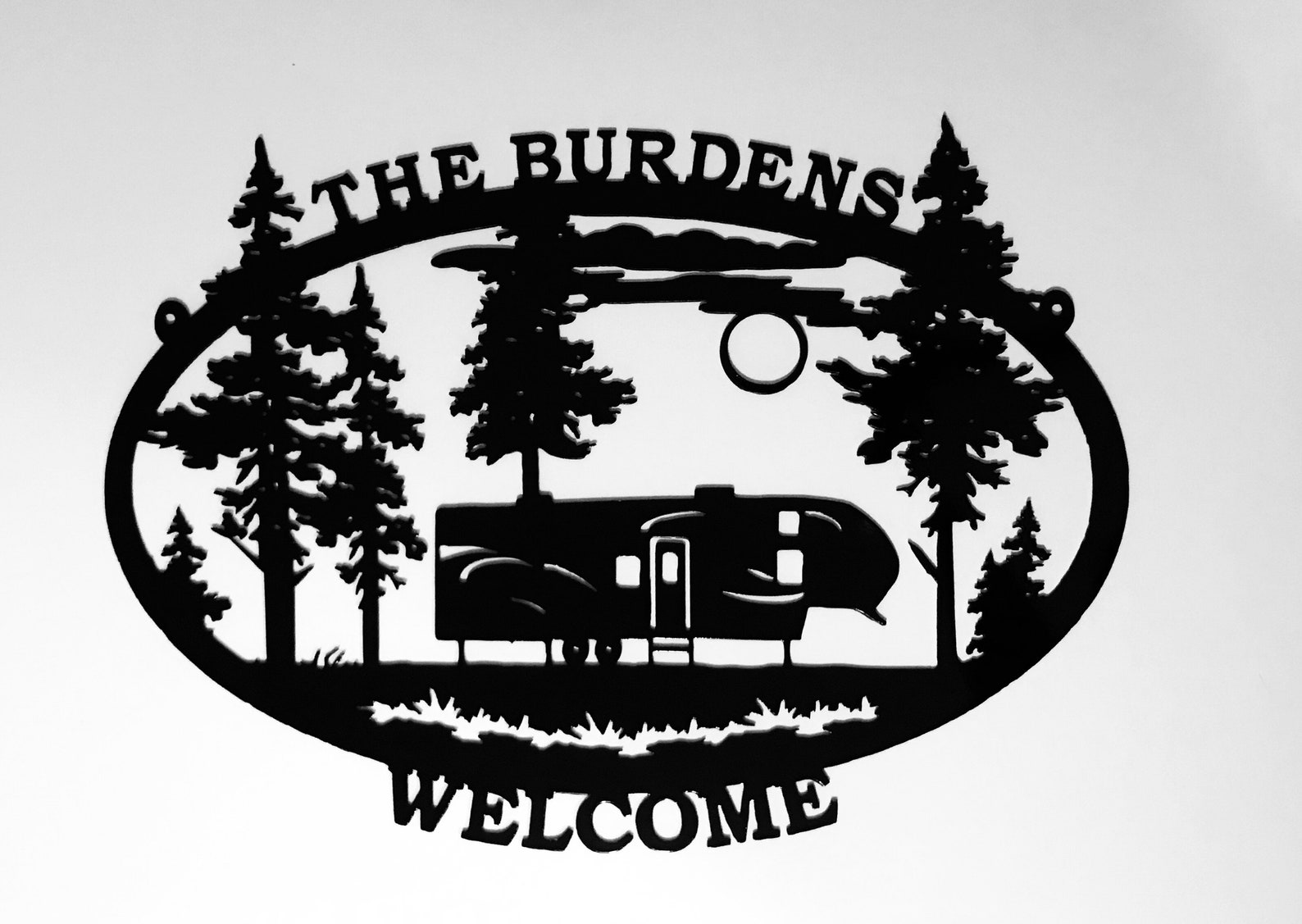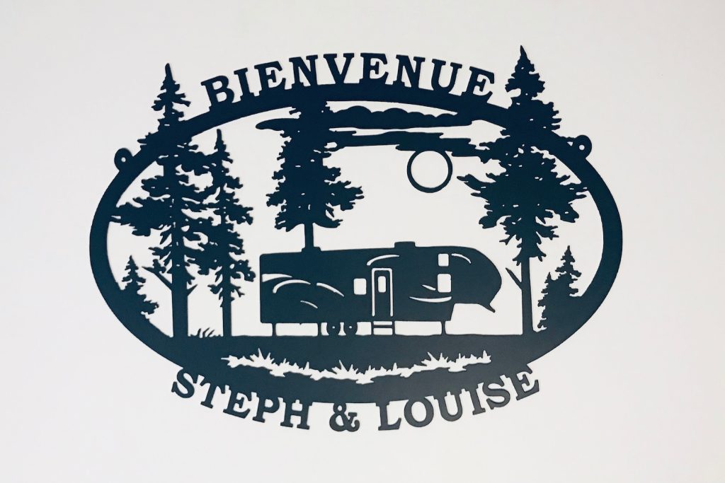 Welcome or Bienvenue personalized fifth wheel camper sign for inside or outside use. Great for campground or home. 16 gauge steel, powder coated black. Can be hung flat on a wall or from chain. Signs are individually made, not mass produced. Can be made with name up top, welcome on bottom OR welcome up top, name on bottom. There is also a listing on to order this sign not personalized.
