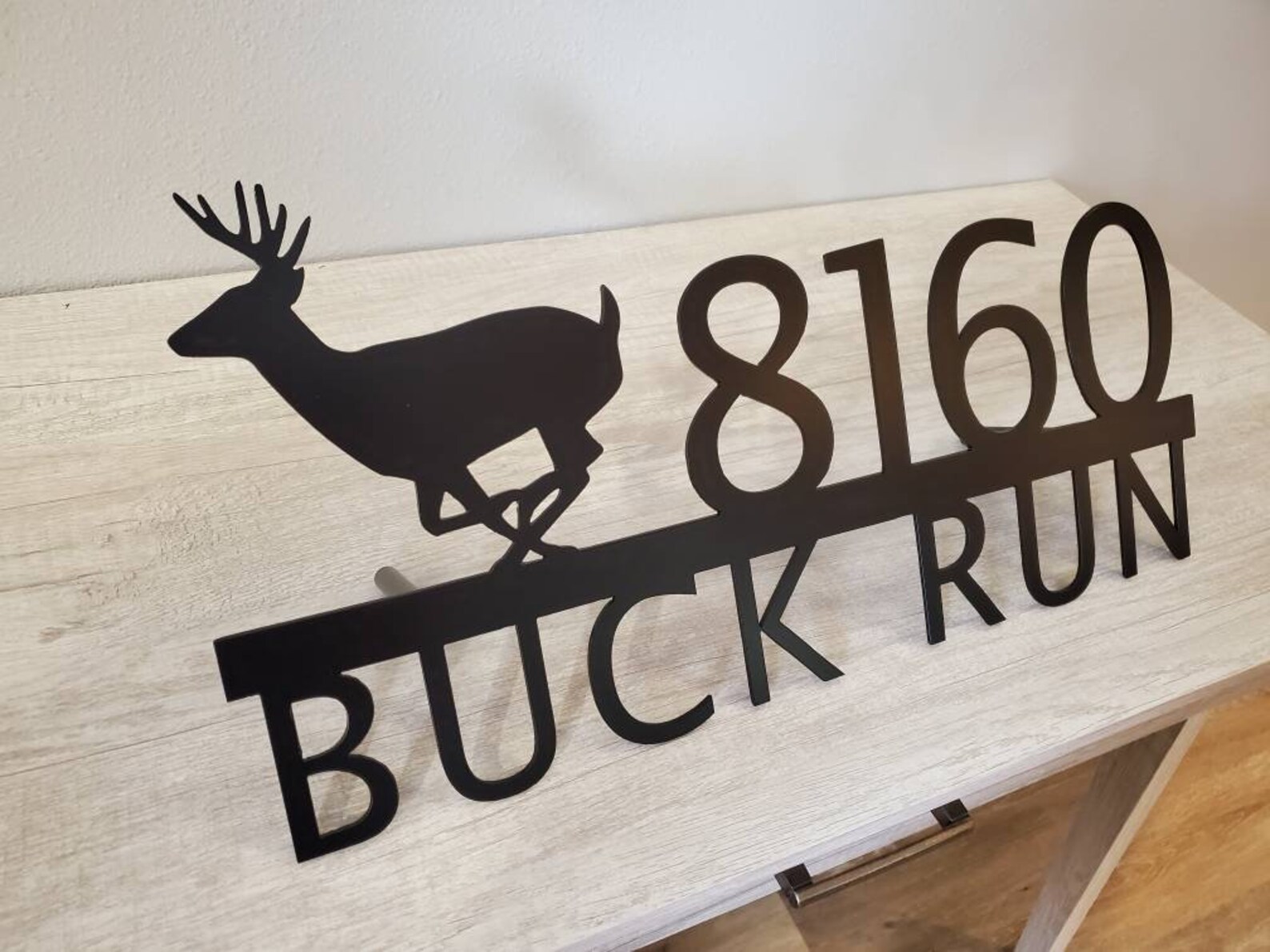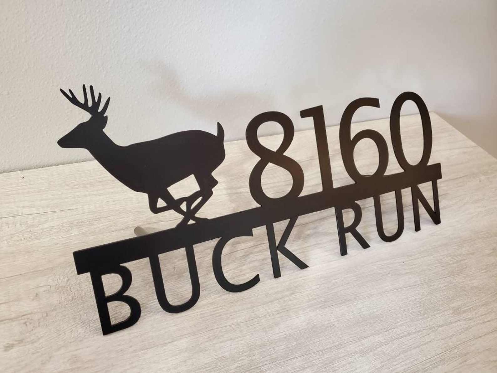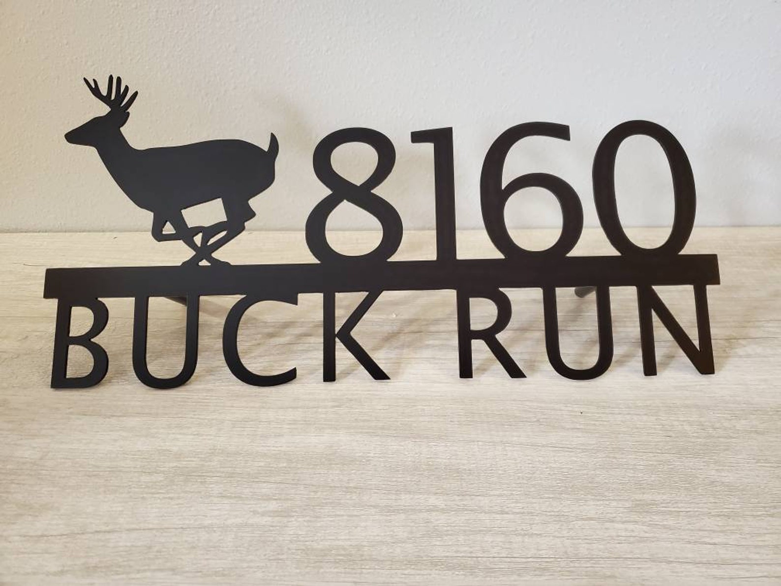Custom metal personalized address sign/house numbers with running buck deer for your rock or wall. Finished with highly durable exterior matte black powder coating. This address sign is made out of highly quality durable/sturdy 1/8 inch thick steel(12gauge). This gives the item a very sturdy feel. We will send you a mock-up of the design. Size is 1 but the height does vary slightly depending on text length.