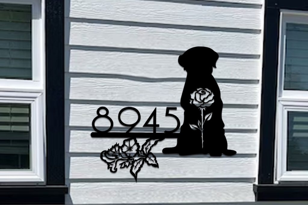 Horizontal Dog Silhouette Address Sign. Made with 14 gauge American made steel and powder coat to help prevent rust and discoloration. Made from high-quality metal, our custom address sign is durable and weather-resistant, ensuring that it will last for years to come. The sign can be customized with your address or any other text that you choose, making it a truly unique and personalized addition to your property. It can be used as a family property to last for generations.