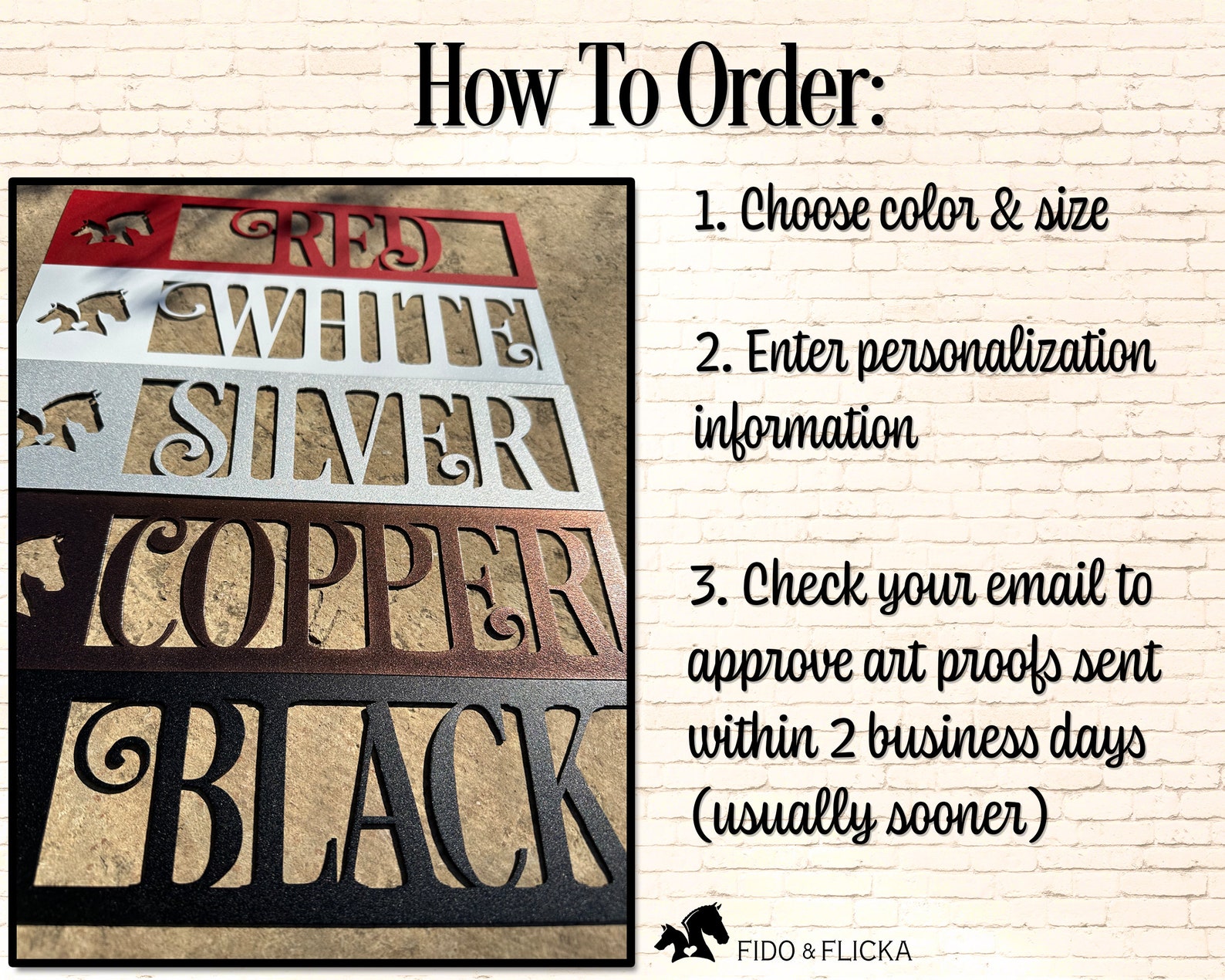 Made with 18 gauge steel and powder coated in your choice of 5 colors, this sign is built to withstand the elements for years of enjoyment. Add a touch of elegance to your home on the inside, outside, or both!