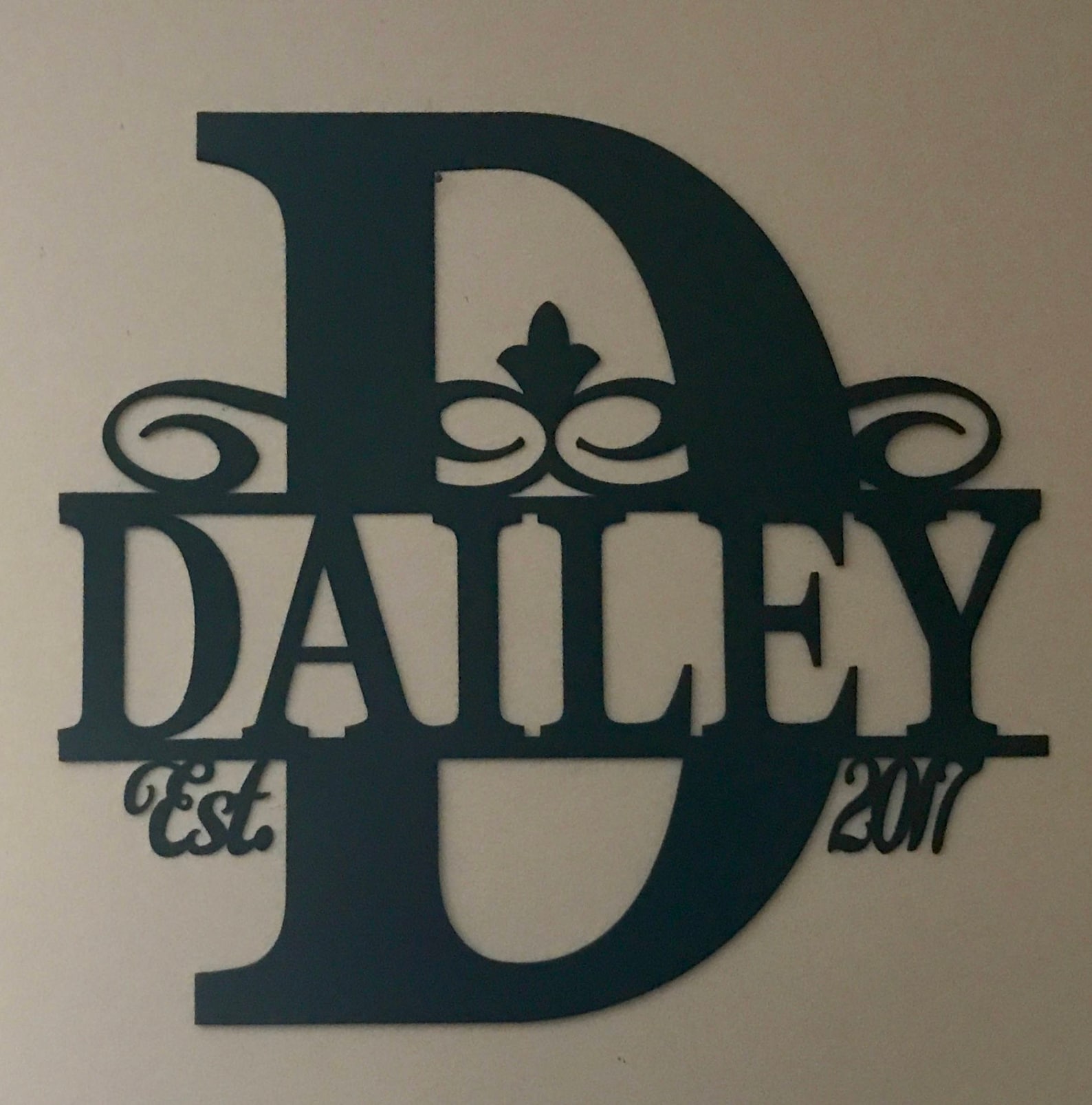 Initial with family name and established year metal sign with a scroll accent.