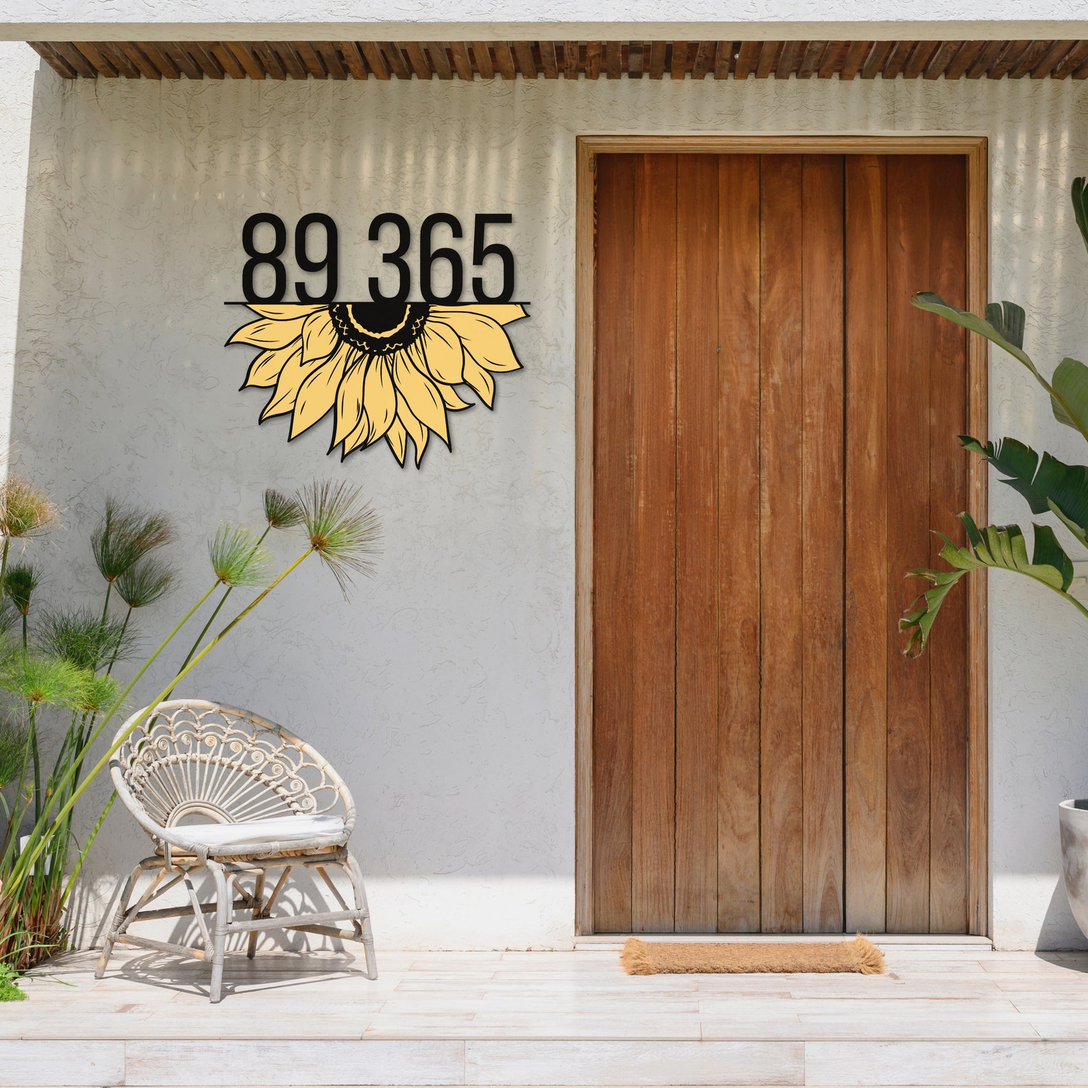 Personalization Options: Make this sign uniquely yours by choosing your preferred names, text, and house numbers. Customize the placement of the split sunflower design to suit your style.