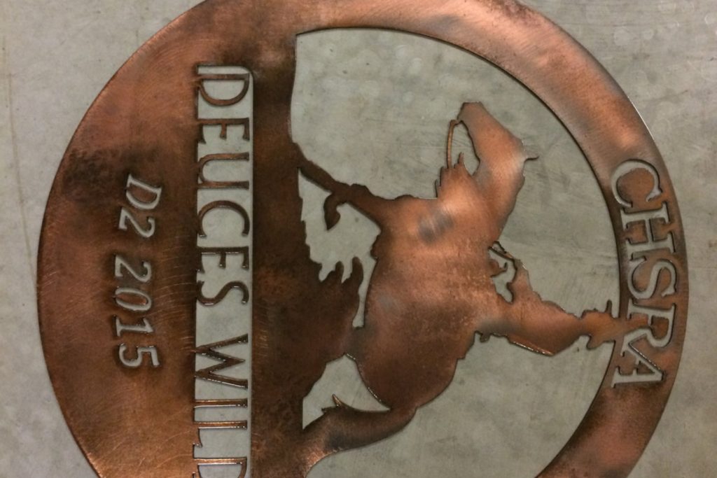 rodeo scene sign in gorgeous copper acid wash and baked on clear coat or solid baked on powder coat finish in black or silver.