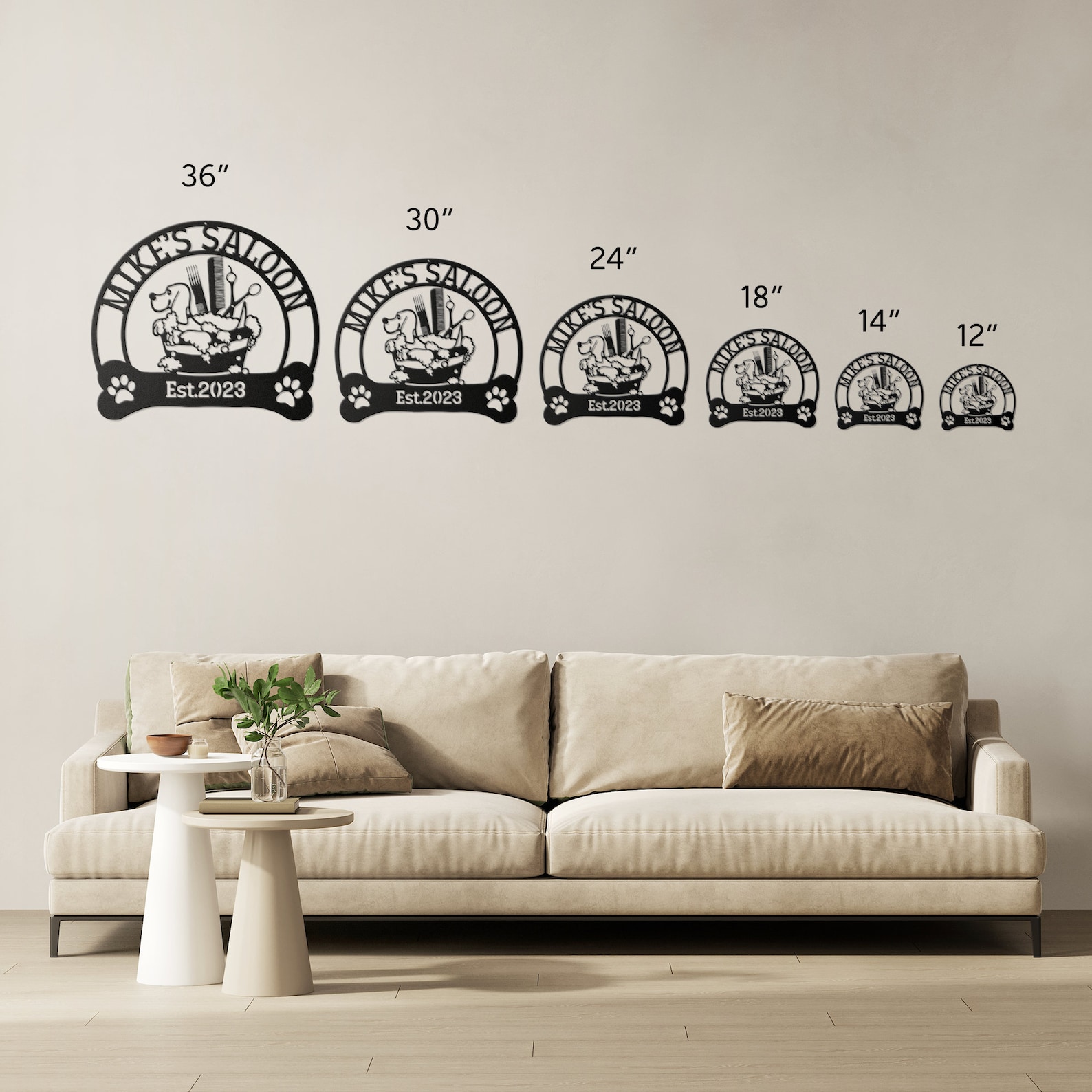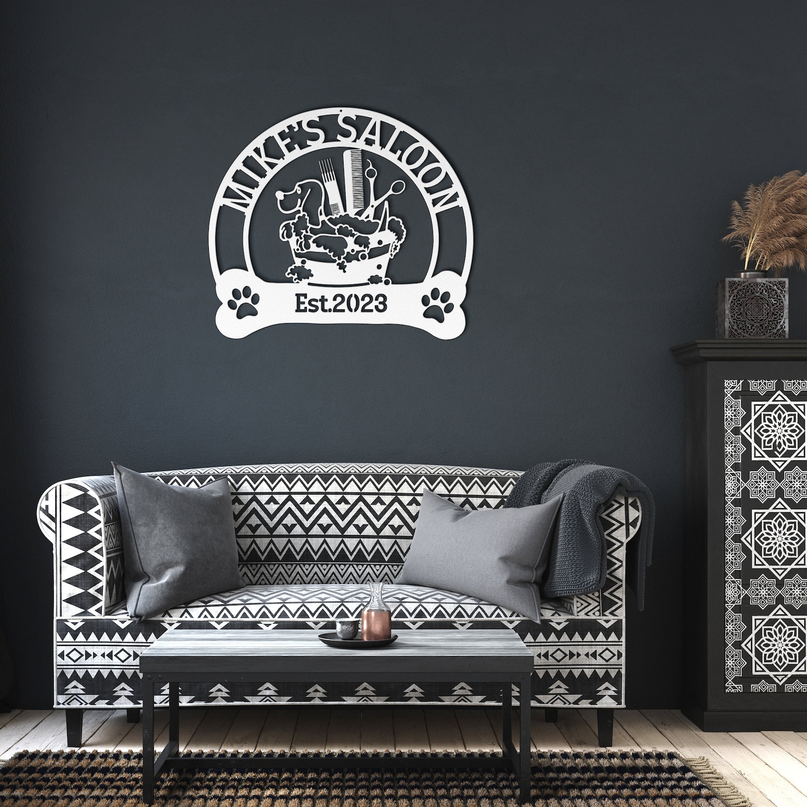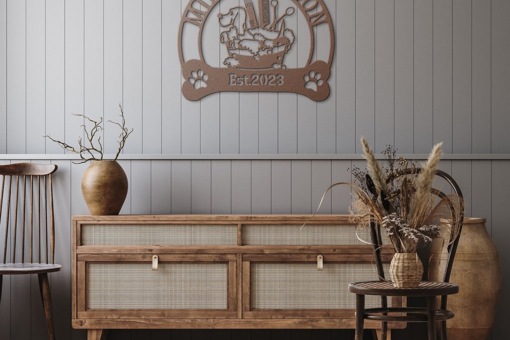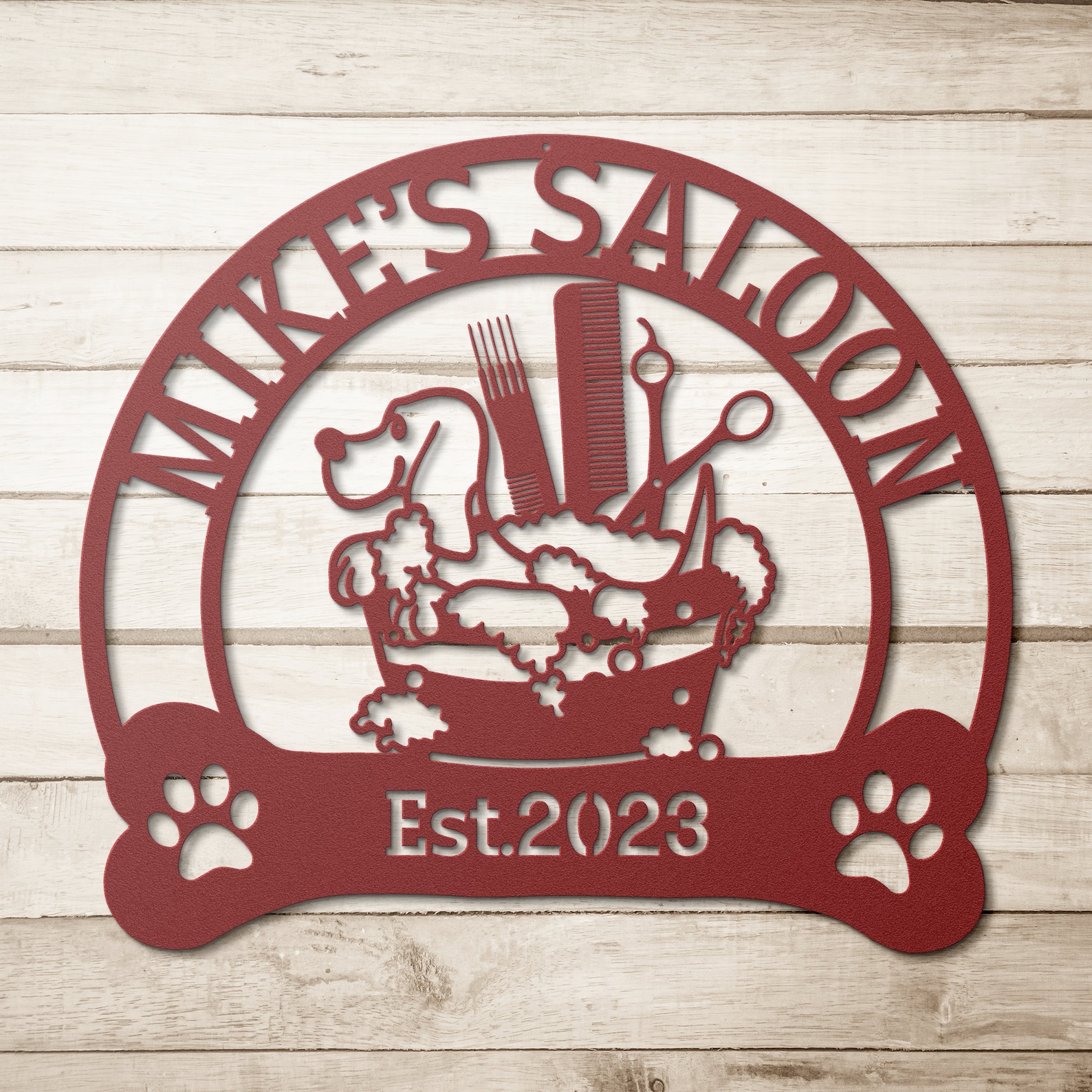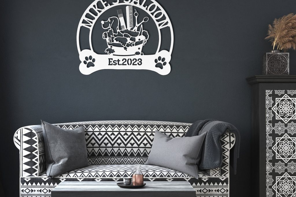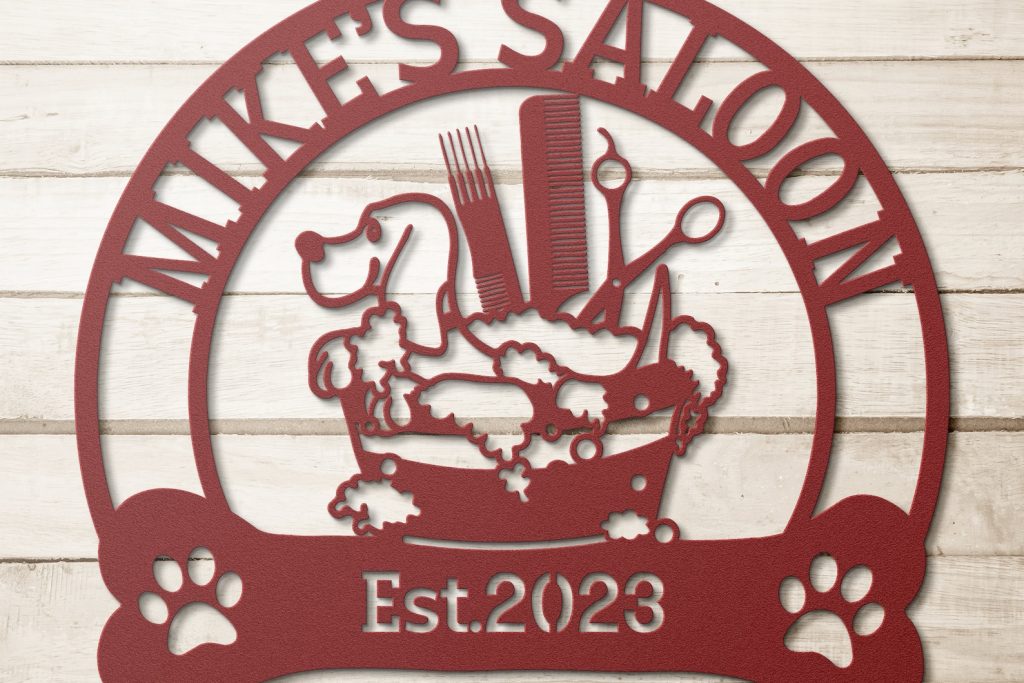 Introducing our stunning Custom Dog Grooming Hair Salon Metal Wall Art! This exquisite piece will add a touch of elegance to any pet grooming salon or home decor. Expertly personalized with the name of your beloved groomer, this beautiful sign is a must-have for any passionate pet owner. Crafted with care, this handmade decoration is perfect for showcasing your saon name. It also makes a thoughtful Christmas gift for any pet enthusiast. Enhance your space with this unique and customizable wall art that truly captures the essence of pet grooming and adds a charming touch to any room.