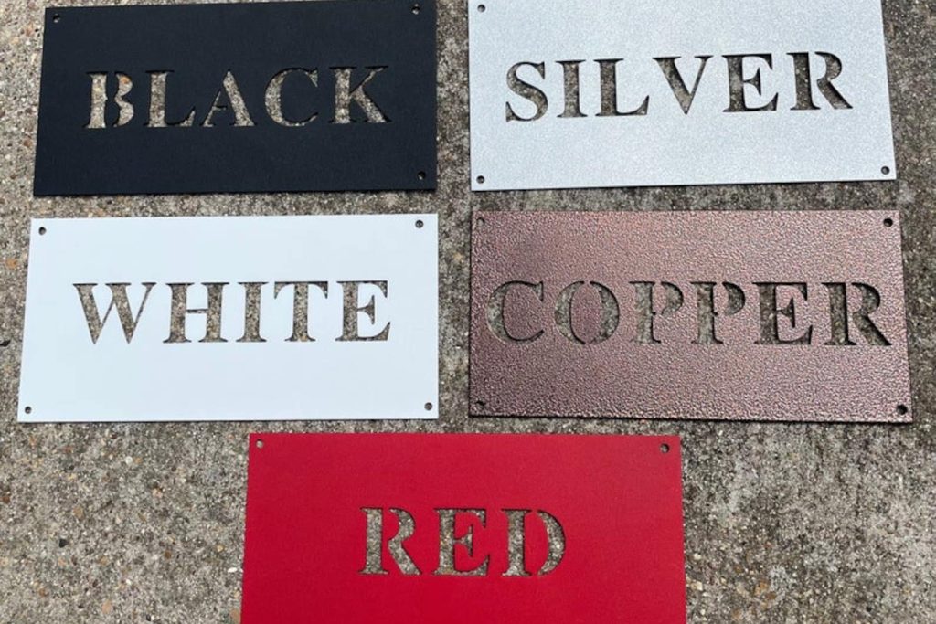 Each sign is powder coated to protect the surface of the steel and to give a shiny, beautiful finish. Powder coat is a thick, sturdy material used to protect outdoor furniture, machinery, even household appliances. We find that powder coating offers more reliable protection for our pieces than paint.