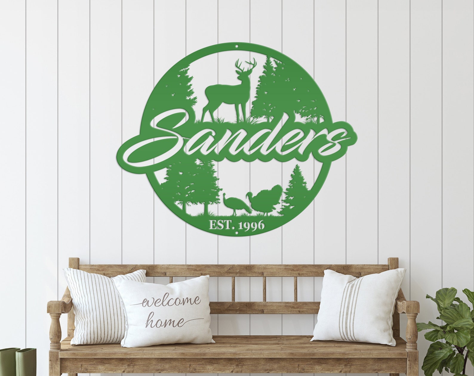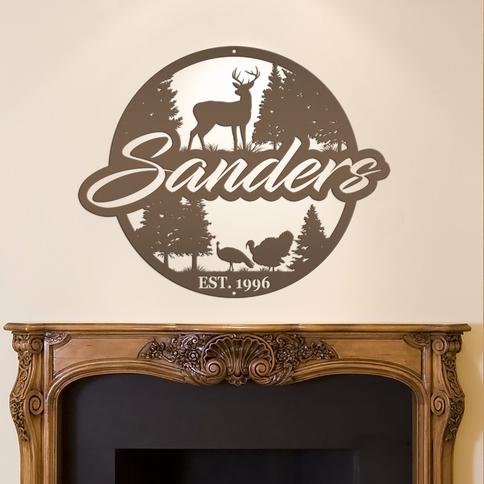 You will love the detail of our Metal Personalized Family Name Sign with Deer and Turkey Outdoor Scene. This sign would be a great addition to add home, cabin, or lodge. Makes a great gift for the hunter in your life!