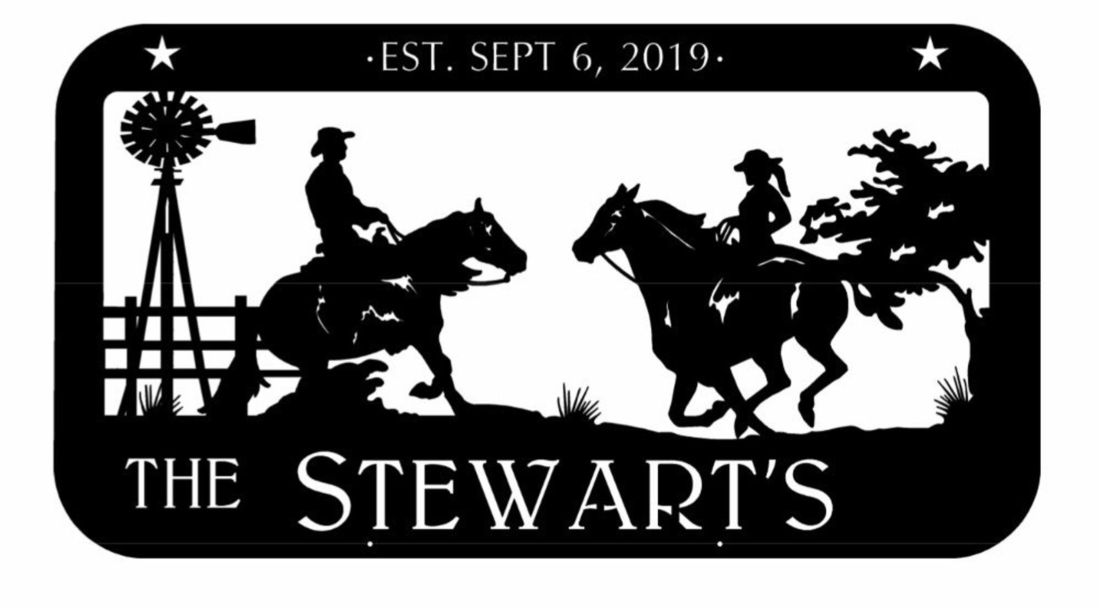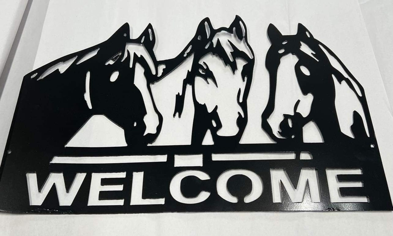 Metal sign featuring 3 horses, with the word Welcome, or can be personalized with your own word or saying, (12 characters or less.)
