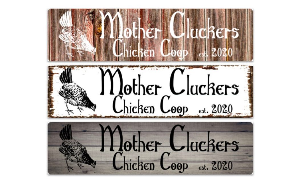 PERSONALIZE your Mother Cluckers choose from 4 backgrounds – Barn wood, Grey Wood, White Crackle- wood or Rusty style backgrounds – Metal Sign Door Plaque – (Note not actual wood so smooth and safe to the touch)