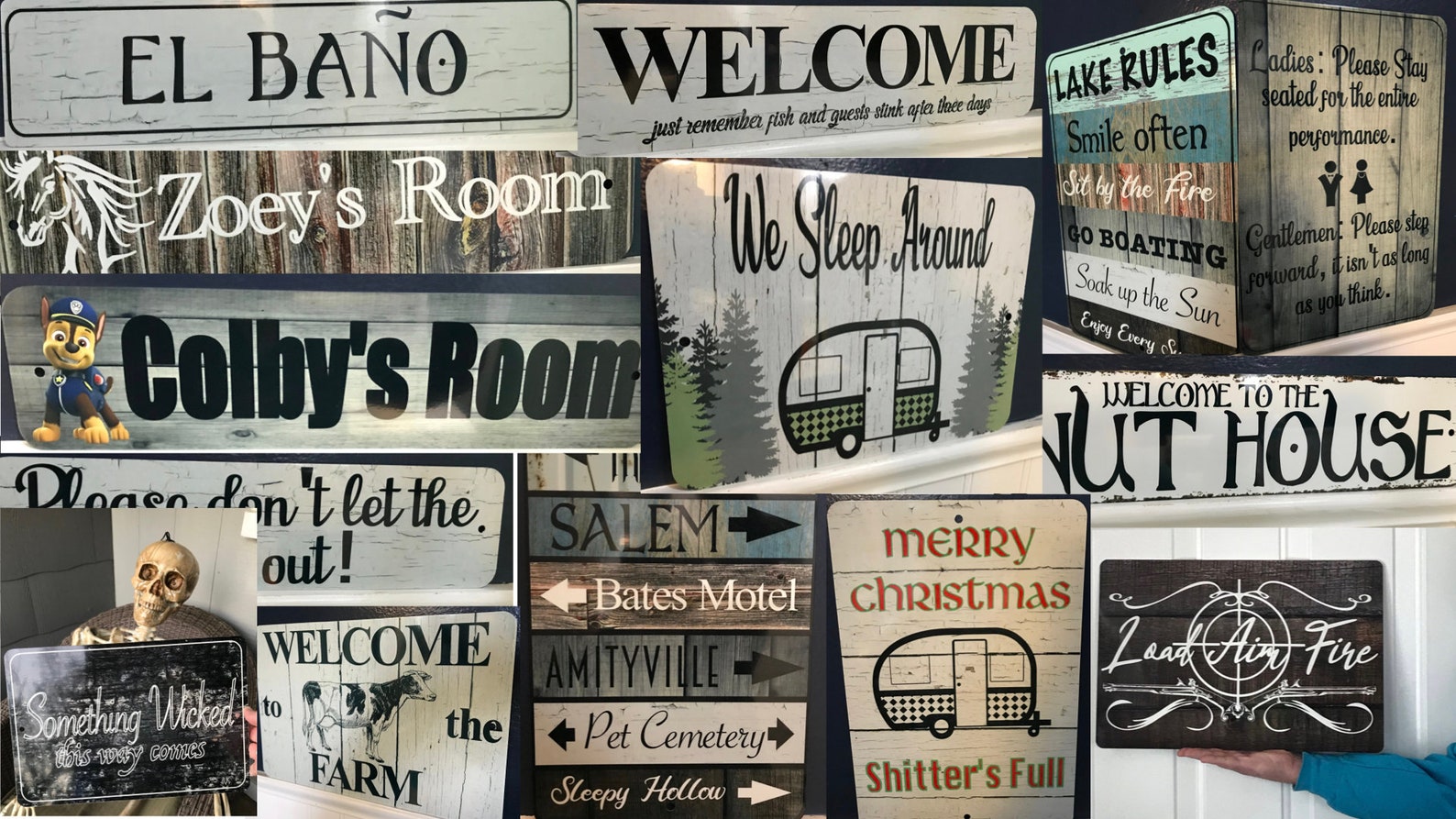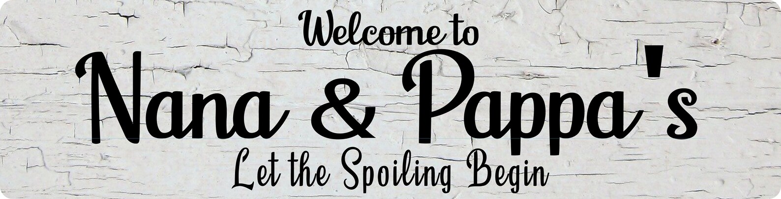 PERSONALIZE Welcome to Grandma n Grandpa9;s let the spoiling begin – choose background – Barn wood, Grey & White Crackle- wood style backgrounds – Metal Sign Door Plaque – (Note not actual wood so smooth and safe to the touch)