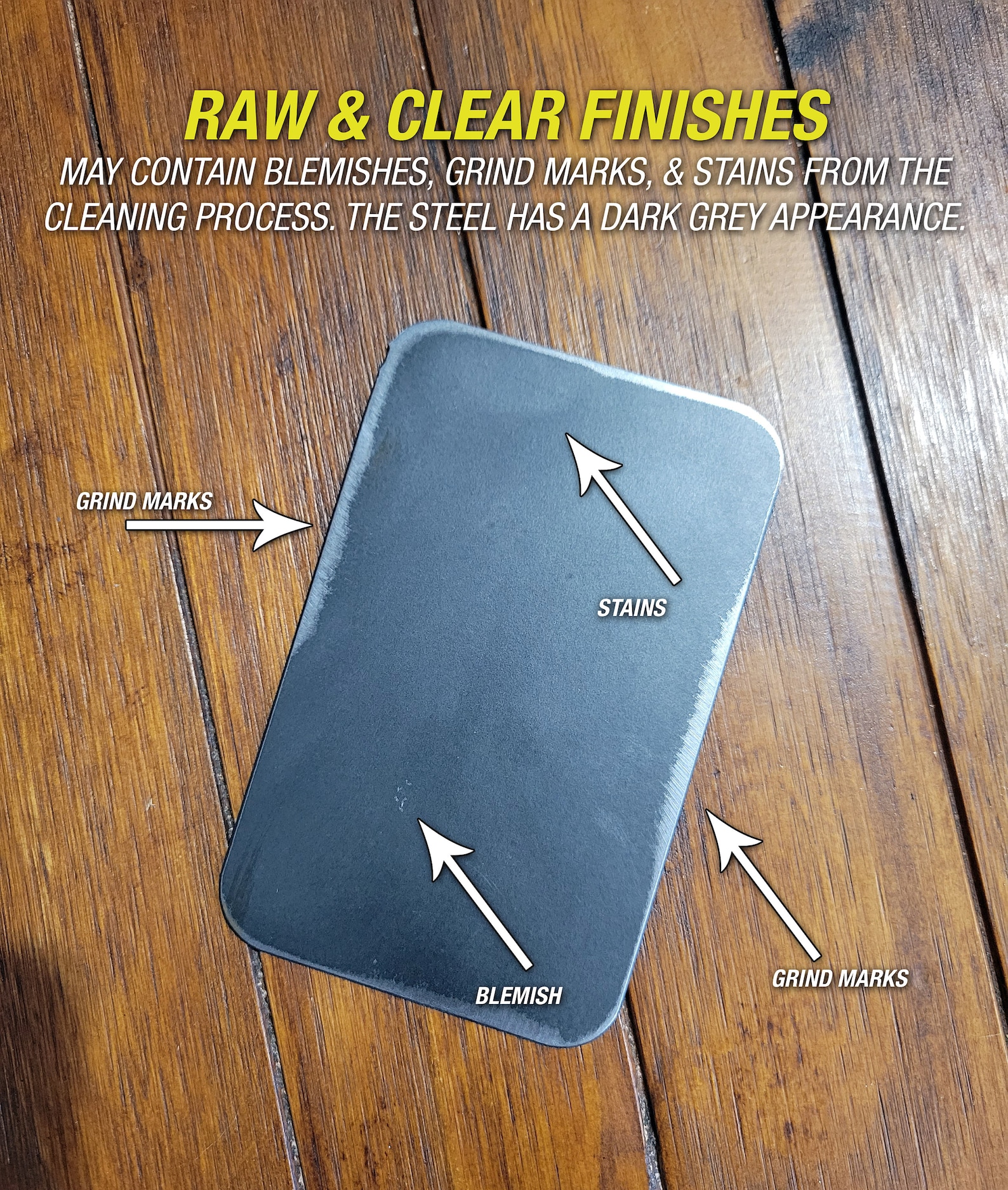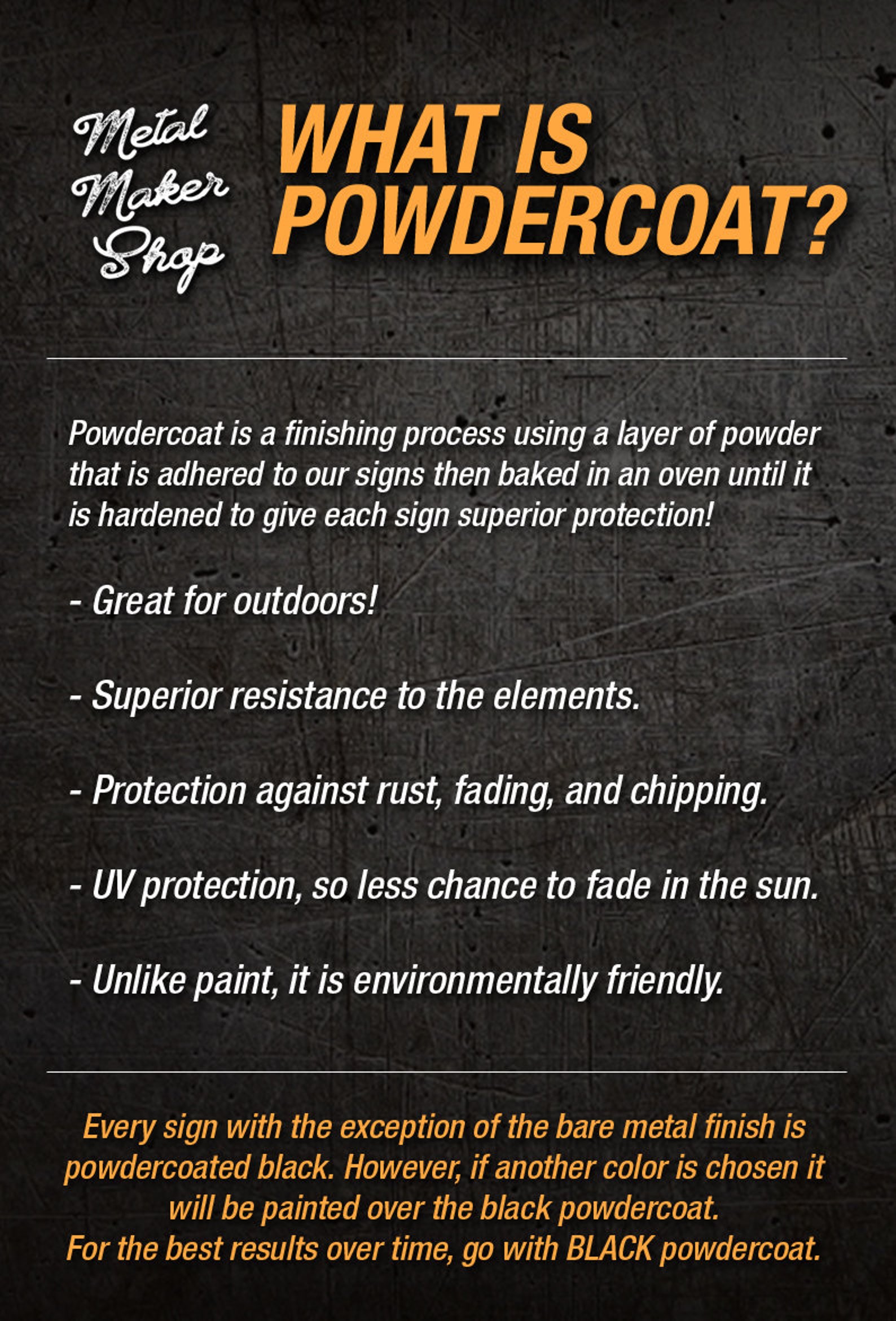 – Clear: Gives a more industrial look to the sign. Dark gray in color with markings such as patina, scratches, or grind marks from the cleaning process that are unique to each metal sign. The steel is then painted with a clear coat to help protect it from rusting.