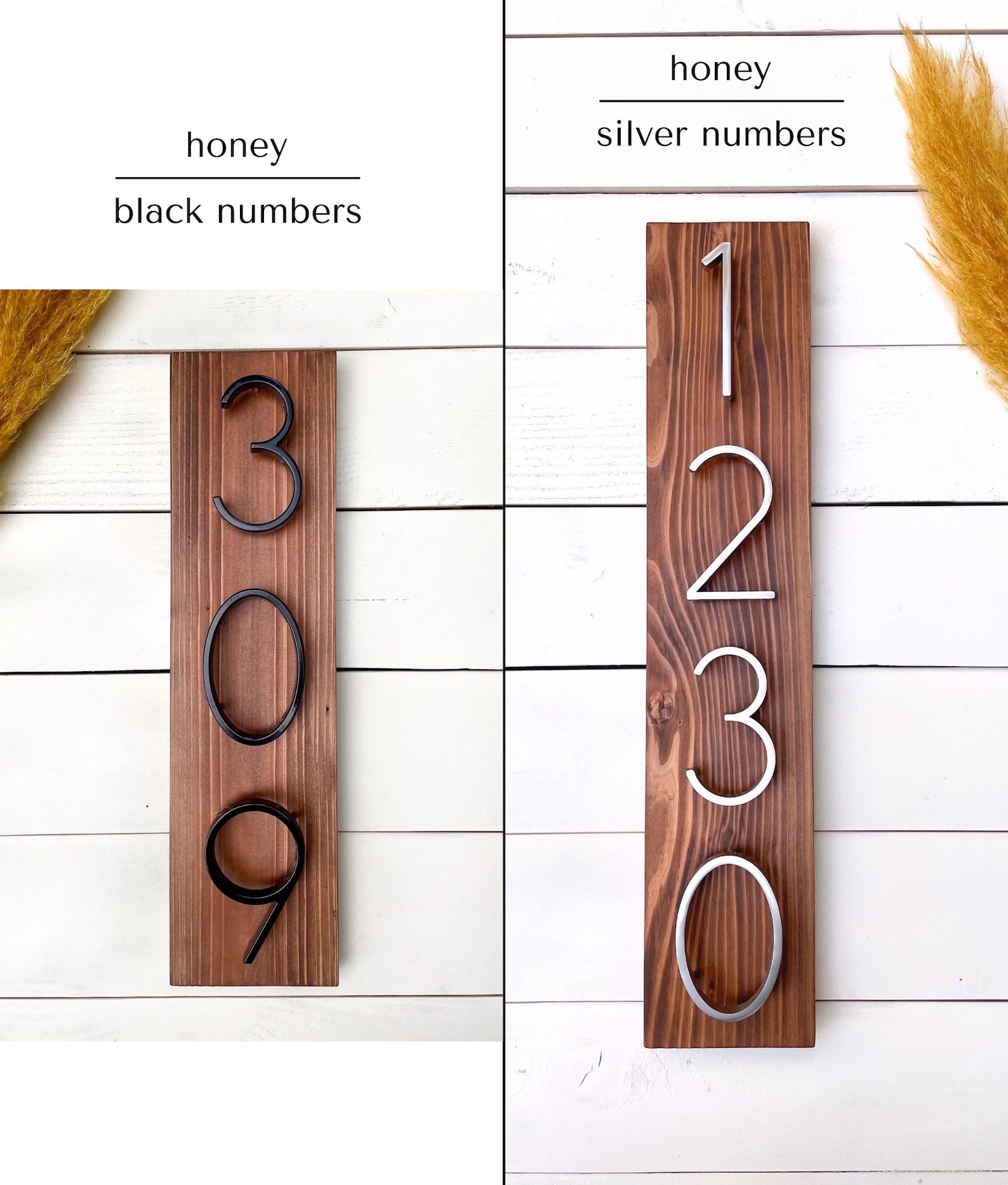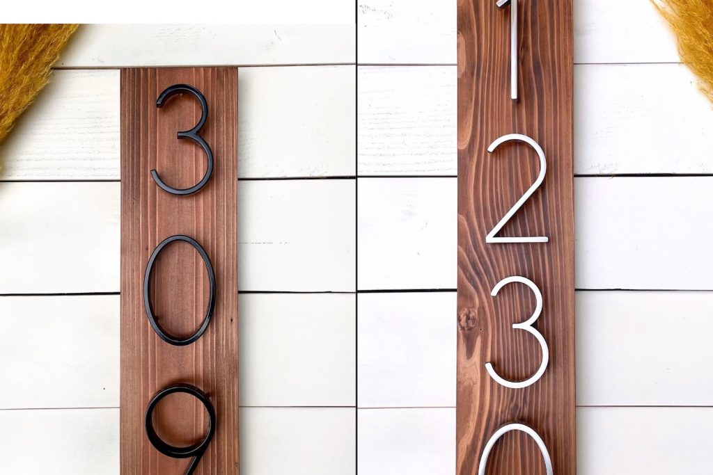 Our signs are made on CEDAR wood (durable, a natural insect repellent, moisture resistant and long lasting) with metal 5in numbers.